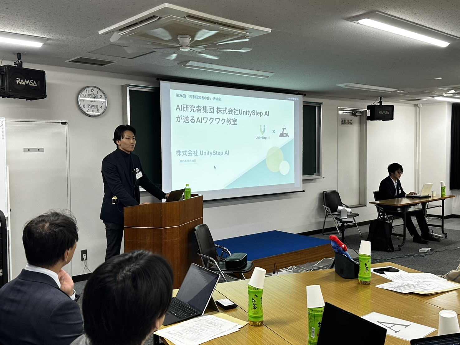 「AI研究者集団 株式会社UnityStep AIが送るAIワクワク教室」と題した本講演では、企業のAI活用の現状や課題を踏まえ、プロジェクトにおけるAIの効果的な活用方法を90分間のワークショップ形式で解説しました。