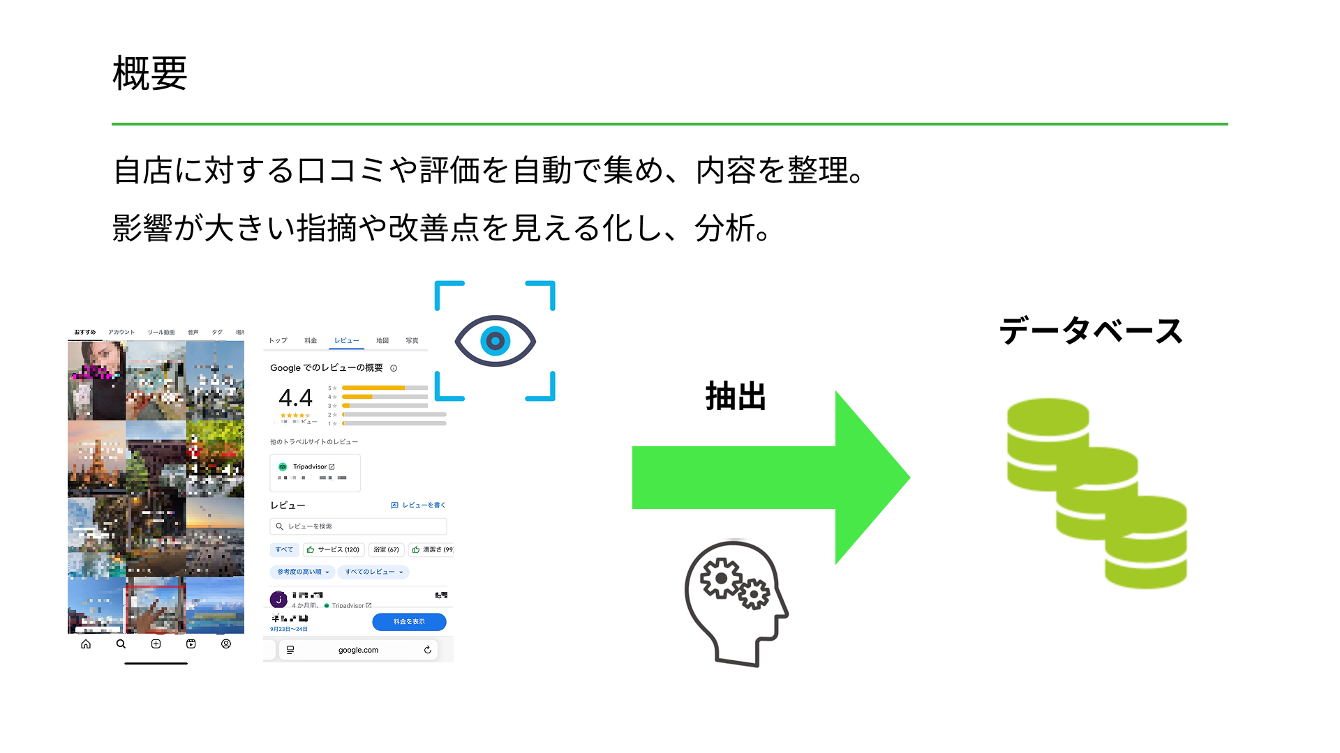 Googleマップや予約サイト、SNSの口コミとアンケートを自動で集め、内容をテーマごとに整理します。そこで影響が大きい指摘をスコアで見える化し、ダッシュボードで提示後、口コミ変化も自動で追いかけます。