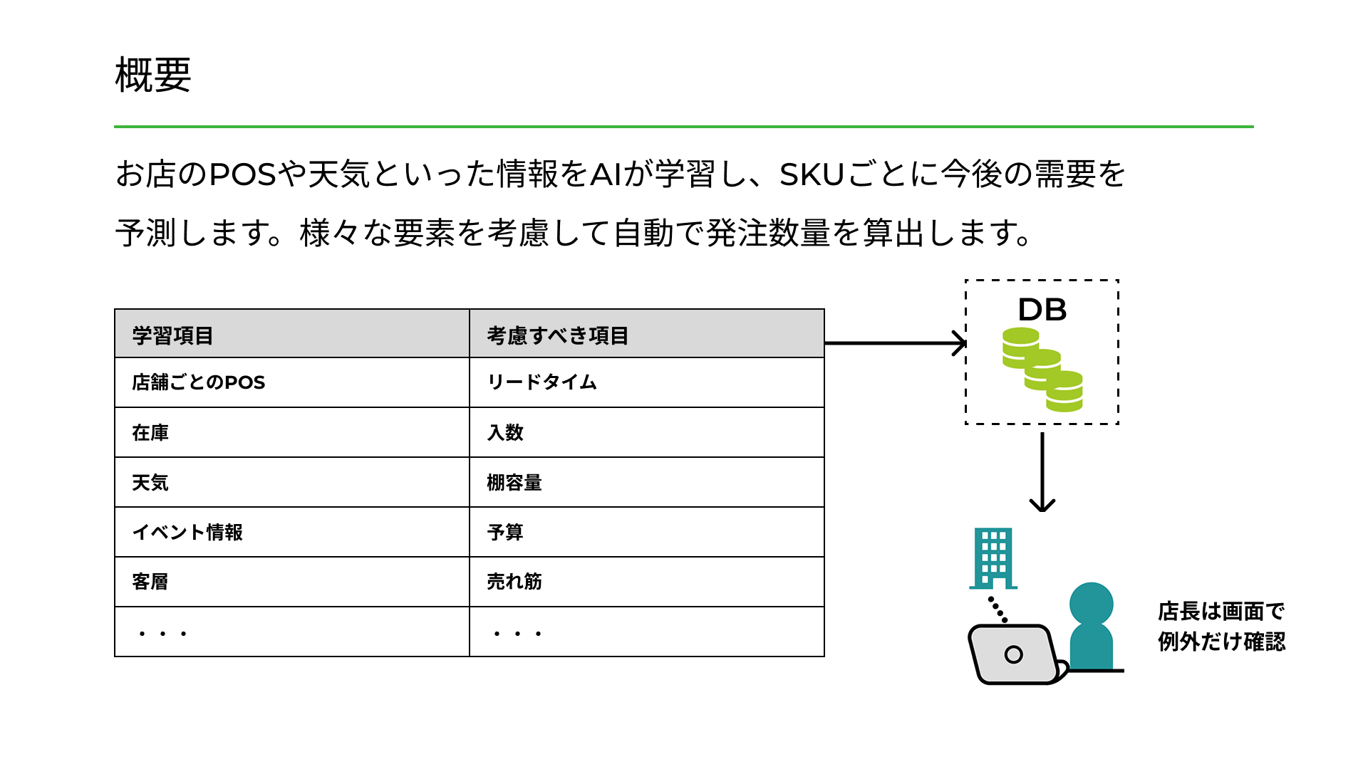 店舗のPOSと在庫、天気やイベント情報をまとめて学習し、SKUごとに翌日の需要を予測します。