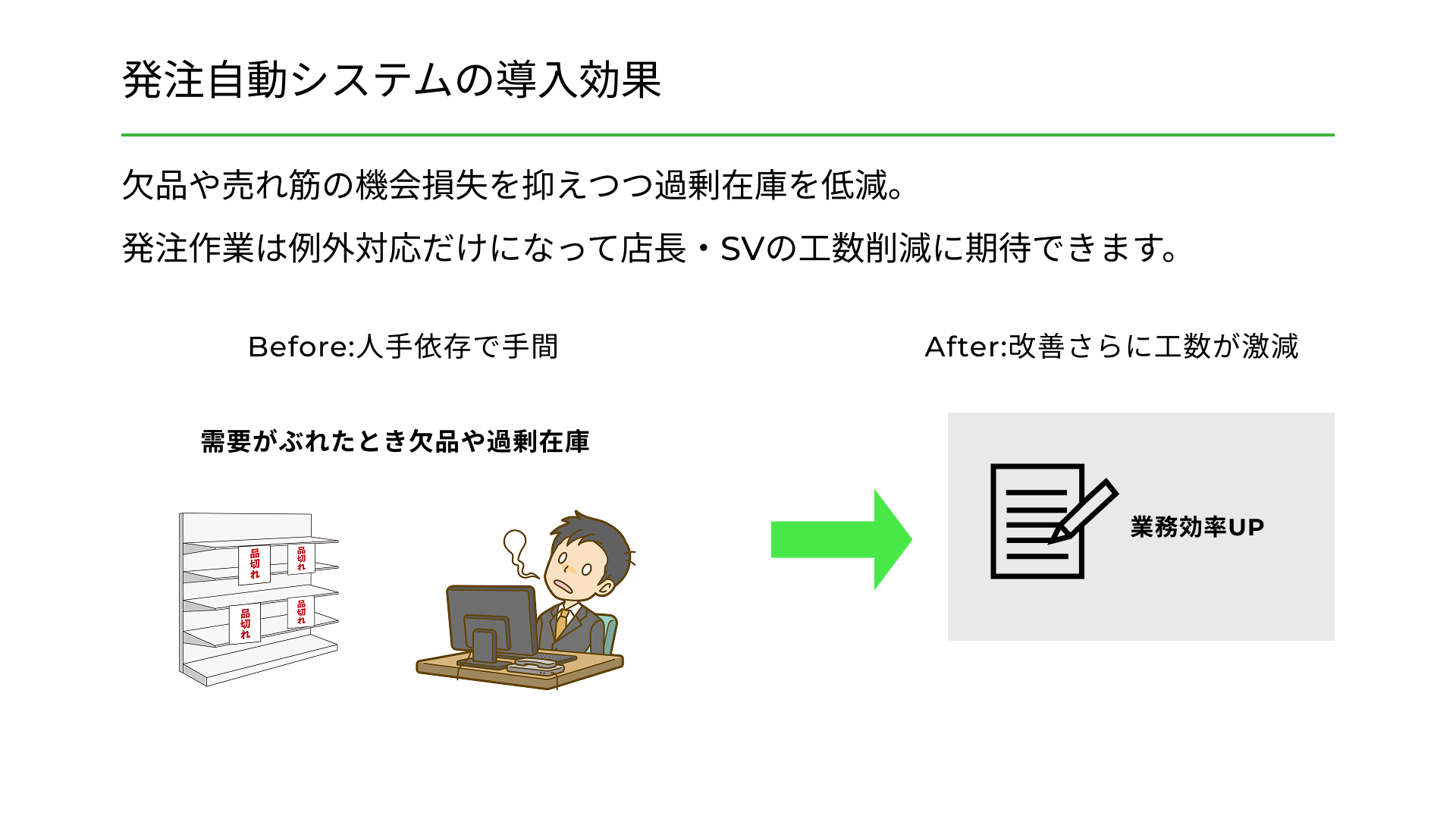 発注作業は例外対応中心になり、店長・SVの工数が削減されます。