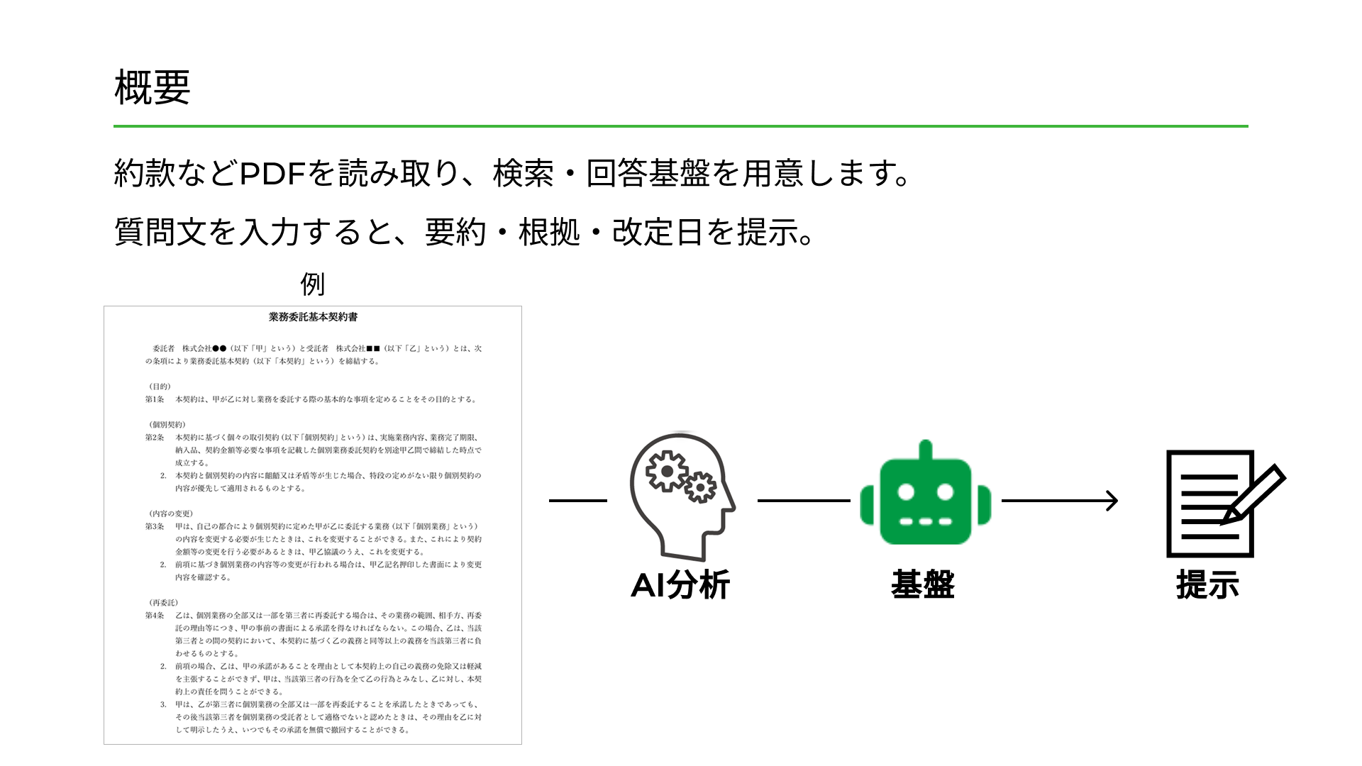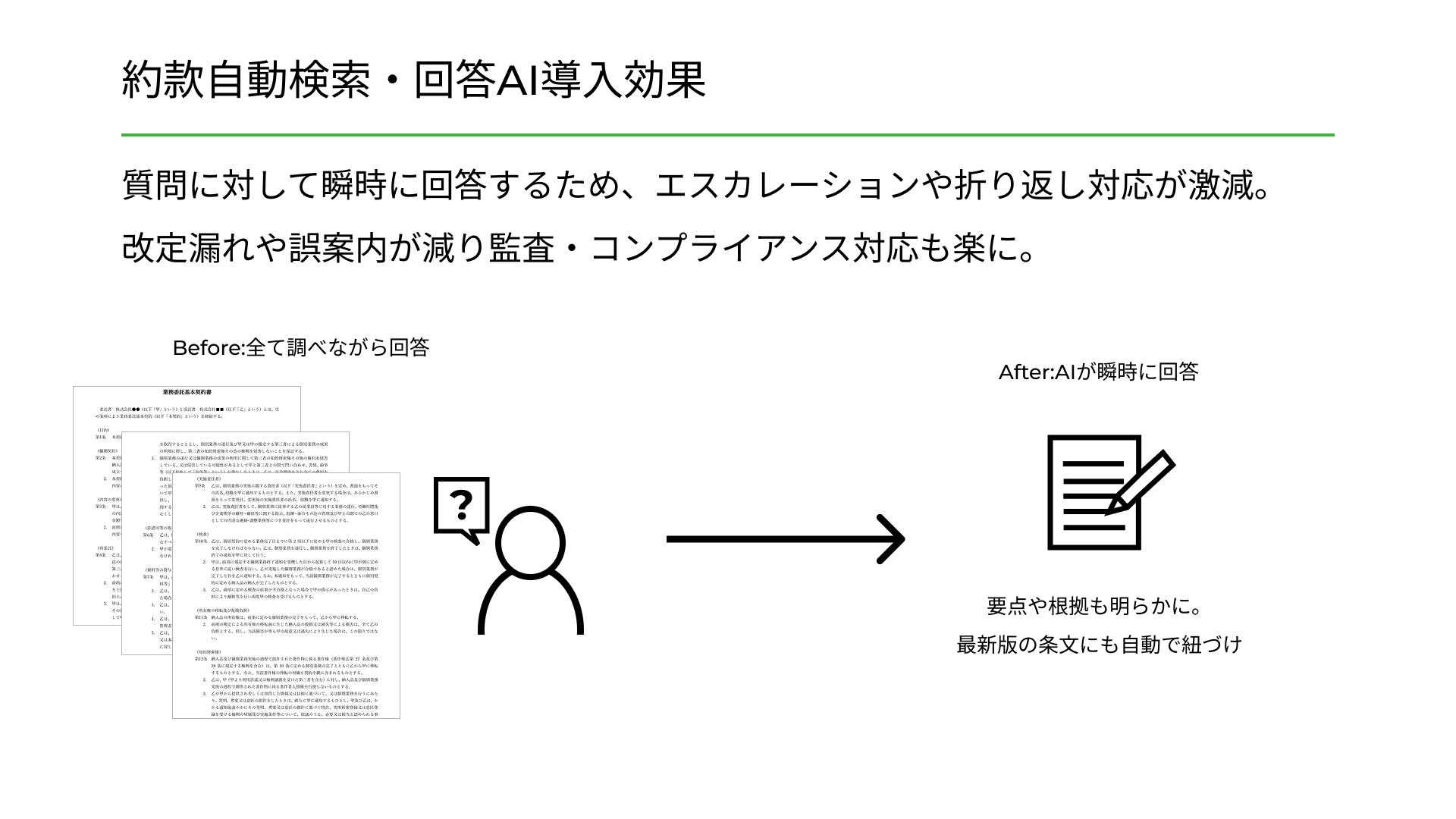 質問に対して数秒で要点と根拠条文が返るため、エスカレーションと折り返し対応が減ります。